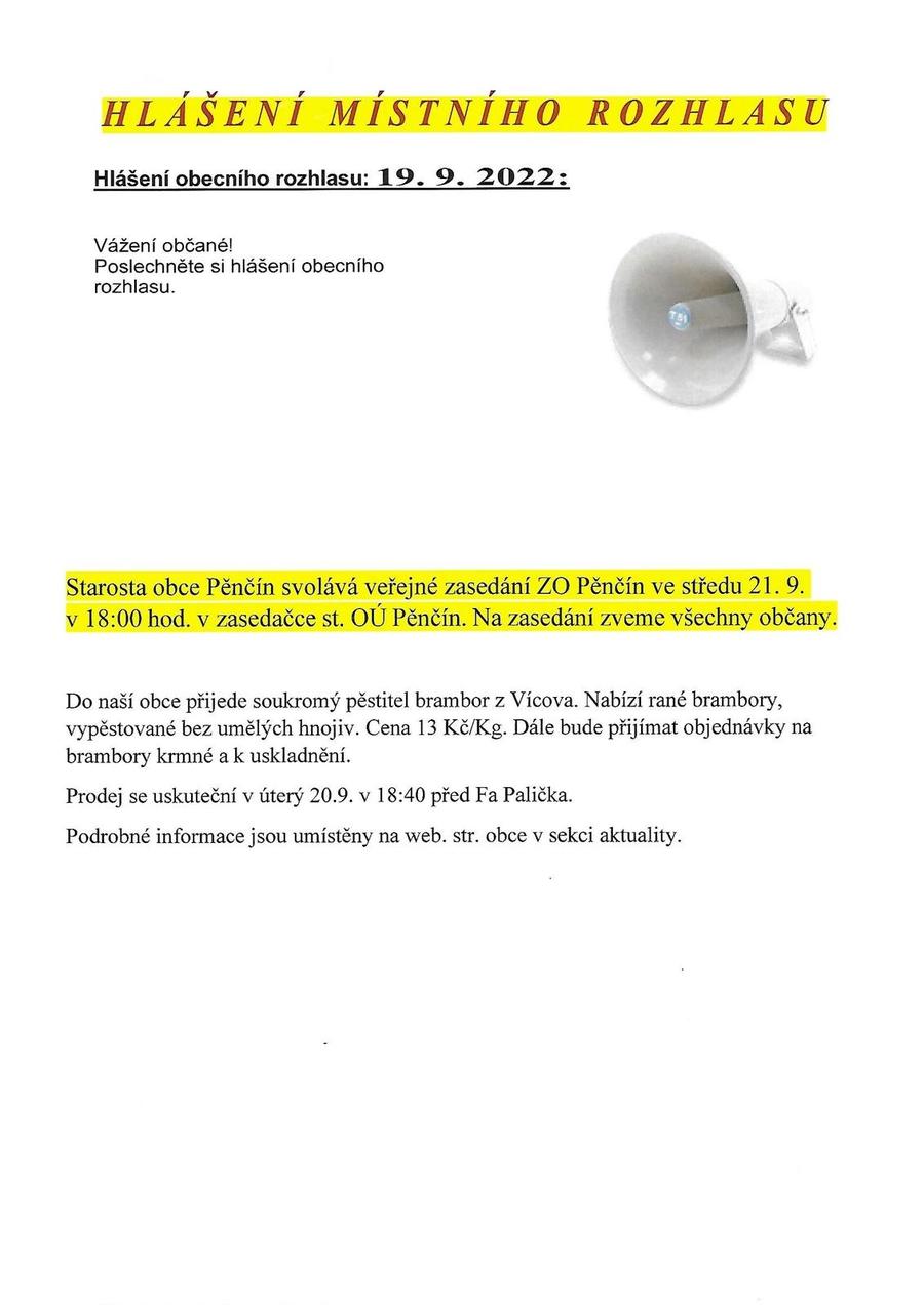 Hlášení obecního rozhlasu 19. 9. 2022