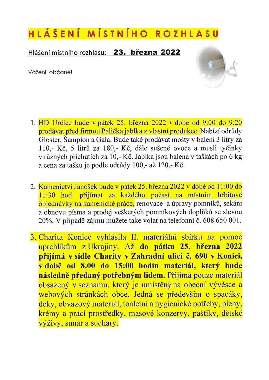 Hlášení obecního rozhlasu 23. 3. 2022