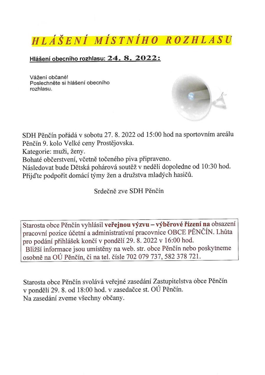 Hlášení obecního rozhlasu 24. 8. 2022.jpg 9. kolo Velké ceny Prostějovska Pěnčín 27. 8. 2022_0001.jpg Dětská pohárová soutěž Pěnčín 28. 8. 2022.jpg