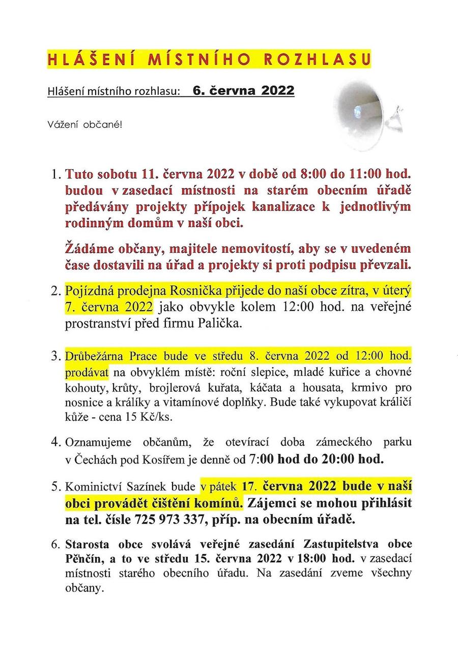 Hlášení obecního rozhlasu 6. 6. 2022