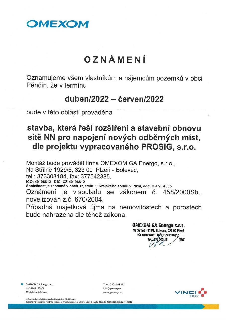 Oznámení o realizaci stavby Pěnčín, úprava DS NN